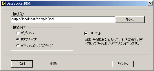 ■DataSocket データソケットは、アプリケーション間のデータ通信を簡単に実現します。 アプリケーションは、同じパソコン上で動作していてもいいし、ネットワーク上の他のパソコン上で動作していも構いません。 では、これで何ができるでしょうか? 1.独立に動作しているアプリケーションでデータを共有する。 データソケットは、ActiveXなので、開発環境の違う(VBとLabVIEW等)アプリケーション同士でも簡単にデータの共有ができます。 ファイルやデータベースを介すことなくデータ共有できるので、タイムラグの少ないデータ共有アプリケーションを作成できます。 又同じデータを監視することにより、複数のアプリケーションを同期させて動作させることも可能です。 LabVIEWでは、グローバル変数を使用することで、同様なこともできます。 しかし、汎用性を考慮するとデータソケットを使用した方がベターです。 注)マルチタスク動作や、ネットワークの転送ディレ−による同期のタイムラグは発生します。 2.他のパソコン上にあるアプリケーションを監視・制御する。 これもLabVIEWではグローバル変数を使用してもできますが、@と同じ理由で、データソケットを使用した方がベターです。 データの収集・制御をLabVIEW、データ管理をVBでおこなう等、各開発環境の特性を生かしたシステム構築ができます。 LabVIEWでデータソケットを使用する方法は2種類あります。 (1)ダイアグラムに処理を書き込む ダイアグラム上で、「DataScoket Read」「DataScoket Write」Viに、下図のように、データを受け渡すURLを直接書込みます。 この方法は、ダイアログの一部としてデータソケットを使用できるので、処理方法のシーケンス(条件判断等)を組めます。 (2)フロントパネルの制御器(表示器)にデータソケットを設定する。 フロントパネル上の制御器や表示器で「右クリック」→「データ操作」→「DataSocket接続...」で下図表示させます。 接続先には、URLを直接割り当てます。 接続タイプは、使用方法により次のようになります。 ・パブリッシュ:VI上の制御器のデータをデータソケットに送信する。 ・サブスクライブ:VI上の表示器にデータソケットのデータを表示する。 ・パブリッシュ&サブスクライブ:VI上の制御器が他のVI上の制御器を制御(データソケットを通して)します。 すでに完成しているViに対してはこの方法が有効です。 外部から制御をする時や、結果を参照したい時、ダイアグラムを変更しないですみます。 相手が何処にあってもデータ通信ができるデータソケットを使用すると、アプリケーションの応用範囲が大変広くなります。 データソケットは、LabVIEWを使用するにあたって是非ともマスターしたい技術です。 |