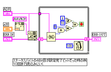 ■光ATT・切替器の制御 ATTや切替器の制御では、設定してから安定するまでに時間がかかるのでウエイト時間を入れる必要があります。 これが光のATTや切替器になると、機械的な稼動部分の制御になるのでこのウエイト時間がより重要になっていきます。 最適なウエイト時間を設定しないと動作が不安定になり、正確な測定ができなかったり、最悪計測器がハングアップします。 しかし、ウエイト時間は、設定によっても変わってくるので、最大値にあわせると無駄な時間を待つことになり非効率です。 このような場合は、どうすればよいでしょうか? 現在市販されているGPIB対応の計測器には、計測器の状態を示すステータスバイトを読取る機能が付いています。 この中に、設定中なのか、設定が完了しているのかを示すビットが通常あります。(必ずあるわけではない) 設定後、これを監視することにより確実に、設定がなされたことを確認できます。 ![]() 上図では、4Bit目が設定完了ビットなので、4Bit目が立ったときにループを抜けるようにしています。 この時の注意点は、ループの中にウエイトを入れることです。 連続的にステータスを読みにいくと計測器がハングアップしたり、計測器のパフォーマンスが落ちる場合があります。 ステータスバイトは読込むことによってクリアされます。 動作を確実にするために、設定の前に一度ステータスバイトを読込んでおいた方がよいでしょう。 光に関する制御は、機械的な稼動部が多く、電気の制御とは違うノウハウを必要としてきます。 計測器の構造をよく理解することにより、より安定したシステムを構築することができます。 |