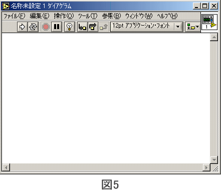 ![]() 1.プログラム(VI)を作るための準備 左側の一番上のボタン「新規VI」を押して ください。 「名称未設定1」タイトルバーに書かれた ウィンドウが開かれます。(図2) これがフロントパネルといって、ユーザー インターフェースとなる部分を作るウィンド ウです。 |