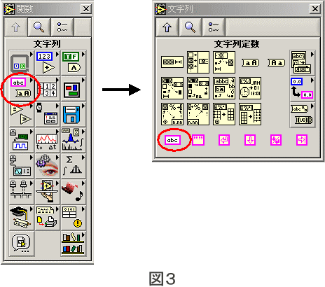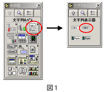 1.新規VIの作成起動画面で「新規VI」ボタンをクリックし、新規のフロント パネルとダイアグラムを表示します。 2.表示領域の作成 制御器パレット「文字列&パス」→「文字列表示器」(図1) を選択し、フロントパネルの適当な場所に設定します。 3.プログラム(ダイアグラム)の作成 フロントパネルの下にあるダイアグラムをアクティブにします。 ダイアグラムには、「文字列」とラベルのついた端子がありますので適当なところに移動させます。(図2) ![]() ![]() 関数パレット「文字列」→「文字列定数」 (図3)を選択し、端子の左側におきます。 ![]() ツールパレット「テキストの編集」を選択し、文字列定数を選択 します。 文字列定数が編集状態(図4)になるので、「Hellow World」と 入力してください。 4.端子と文字列定数の接続ツールパレット「ワイヤの接続」を選択し、文字列定数を左 クリックしてからマウスを端子の方に移動してください。 (図5) ![]() 文字列定数から点線がでてきますので、そのまま端子まで 引っ張り、端子の上で再度左クリックしください。 ワイヤが破線から実線に変わります。(図6) これで、プログラムは完了です。 では、実行してみましょう。 フロントパネルを選択し、実行ボタンを押してください。文字列表示器に「Hellow World」と表示されましたか?(図7) 再度実行する場合は、ツールパレット「テキストの編集」を選択し、 文字列表示器の表示を削除してから実行してください。 せっかく作ったので保存しおきましょう。 メニュー「ファイル」→「保存」で表示されたファイルダイアログに適 当なファイル名を入れて保存します。 読込む場合は、メニュー「ファイル」→「開く」で表示されたファイル ダイアログから開くVIを選択します。 どうですか? 簡単でしたよね。 参考までにC言語で書くと次のようになります。 #include <stdio.h> main() { printf("hello World\n"); } |