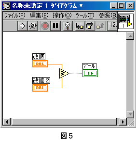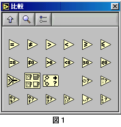 ■比較関数とブール制御器/表示器 LabVIEWには、データの比較をおこなう関数があります。(図1) 比較の結果はブール値として出力され、正しければ「TRUE」(真)、間違っていれば「FALSE」(偽)が出力されます。 では、簡単な比較のプログラムを作ってみましょう。 1.入力と出力の設定 フロントパネルにデジタル制御器を2つと円LEDを1つ設定します。(図2) ![]() 2.比較関数の設定 ダイアグラムに「Grater Or Equal?」関数(≧)を設定します。(図3) ![]() 3.関数の端子の確認 CTRL+Hを押し、ヘルプウィンドウを開きます。 ダイアグラム上の「Grater Or Equal?」関数の上にマウスポインタを置きます。 ヘルプウィンドウには、「Grater Or Equal?」関数の端子の位置が表示されます。(図4) ![]() 4.プログラム(ダイアグラム)の作成 ダイアグラム上のデジタル制御器「数値」と「Grater Or Equal?」関数の入力端子「x」を接続します。 デジタル制御「数値 2」を「Grater Or Equal?」関数の入力端子「y」に接続します。 ブール表示器「ブール」に「Grater Or Equal?」関数の出力端子「x>=y」を接続します。(図5) ![]() デジタル制御器に適当な数値を入れて実行してみてください。 正しい結果が、円LEDに表示されましたか?(比較が正しければLEDが点灯します。) 「Grater Or Equal?」関数を他の比較関数にして確認をしてみてください。 また、押しボタンを円LEDに接続して実行しみてください。(図6) 押しボタンの出力がブール値であることが確認できます。 ![]() |