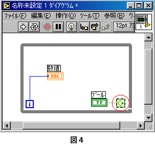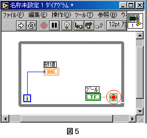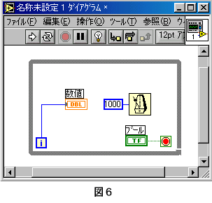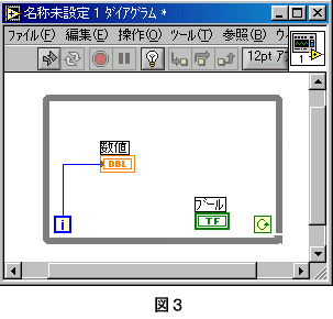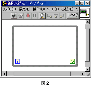 ■Whileループストラクチャの使い方 Whileループは、処理を終了条件が整うまで実行します。 ●Whileループの出し方 1.関数パレット→ストラクチャ(左最上段)→ケース(右最上段) 2.ダイアグラムの上で、左ボタンを押しながらマウスを動かすと破線で四角がひけます。(図1) ![]() 3.左ボタンをはなすと、Whileループストラクチャが表示されます。(図2) ![]() ●Whileループストラクチャを使ってみよう 1.新規VIを開きます。 2.フロントパネルにデジタル表示器と押しボタンを設定します。 3.ダイアグラムにWhileループストラクチャを設定します。 4.デジタル表示器の端子をWhileループストラクチャの中に設定し、「i」端子を接続します。(図3) ![]() 5.Whileループストラクチャ右下の端子に押しボタンの端子を接続します。(図4) ![]() 6.Whileループストラクチャ右下の端子の上で右クリックするとメニューが表示されます。 メニューから「Trueの場合停止」を選択(端子が赤くなる)します。(図5) ![]() 7.Whileループストラクチャの中に「Wait Until Next ms Multiple」関数を設定し、文字列定数を「1000」と設定し接続します。(図6) ![]() 実行してみましょう。 デジタル表示器の値が変化するのを確認してください。 押しボタンを押してください。 プログラムが終了し、デジタル表示器の値の変化が止まることを確認してください。 Whileループストラクチャは、同じ処理を条件が満たされるまで繰り返す時に使用します。 |