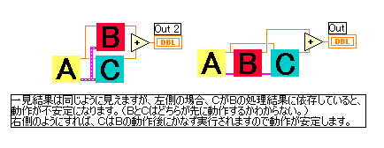 LabVIEWはマルチタスクで動作するのでBとCはどちらが先に実行されるかわからないのです。