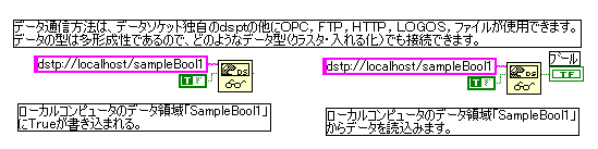 ■DataSocket データソケットは、アプリケーション間のデータ通信を簡単に実現します。 アプリケーションは、同じパソコン上で動作していてもいいし、ネットワーク上の他のパソコン上で動作していも構いません。 では、これで何ができるでしょうか? 1.独立に動作しているアプリケーションでデータを共有する。 データソケットは、ActiveXなので、開発環境の違う(VBとLabVIEW等)アプリケーション同士でも簡単にデータの共有ができます。 ファイルやデータベースを介すことなくデータ共有できるので、タイムラグの少ないデータ共有アプリケーションを作成できます。 又同じデータを監視することにより、複数のアプリケーションを同期させて動作させることも可能です。 LabVIEWでは、グローバル変数を使用することで、同様なこともできます。 しかし、汎用性を考慮するとデータソケットを使用した方がベターです。 注)マルチタスク動作や、ネットワークの転送ディレ−による同期のタイムラグは発生します。 2.他のパソコン上にあるアプリケーションを監視・制御する。 これもLabVIEWではグローバル変数を使用してもできますが、@と同じ理由で、データソケットを使用した方がベターです。 データの収集・制御をLabVIEW、データ管理をVBでおこなう等、各開発環境の特性を生かしたシステム構築ができます。 LabVIEWでデータソケットを使用する方法は2種類あります。 (1)ダイアグラムに処理を書き込む ダイアグラム上で、「DataScoket Read」「DataScoket Write」Viに、下図のように、データを受け渡すURLを直接書込みます。 この方法は、ダイアログの一部としてデータソケットを使用できるので、処理方法のシーケンス(条件判断等)を組めます。 (2)フロントパネルの制御器(表示器)にデータソケットを設定する。 フロントパネル上の制御器や表示器で「右クリック」→「データ操作」→「DataSocket接続...」で下図表示させます。 接続先には、URLを直接割り当てます。 接続タイプは、使用方法により次のようになります。 ・パブリッシュ:VI上の制御器のデータをデータソケットに送信する。 ・サブスクライブ:VI上の表示器にデータソケットのデータを表示する。 ・パブリッシュ&サブスクライブ:VI上の制御器が他のVI上の制御器を制御(データソケットを通して)します。 すでに完成しているViに対してはこの方法が有効です。 外部から制御をする時や、結果を参照したい時、ダイアグラムを変更しないですみます。 相手が何処にあってもデータ通信ができるデータソケットを使用すると、アプリケーションの応用範囲が大変広くなります。 データソケットは、LabVIEWを使用するにあたって是非ともマスターしたい技術です。 |