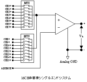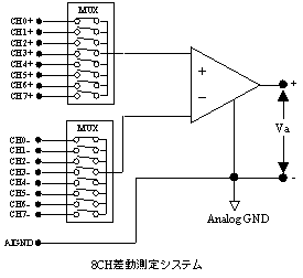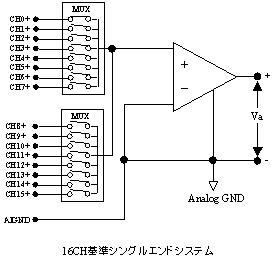 ■パソコンで測定する AIボード編 その3(同時サンプル) 前回説明したように、AIボードの信号の基準化には2種類の方法がありました。 AIボードは通常複数CHの同時サンプルをおこなえる構造になっています。 ここでは、各基準化での複数CHの測定について説明します。 1.差動測定システム 複数の入力CHをアナログマルチプレクサで切替、差動測定システムに信号を入力します。 このシステムでは、複数のアナログ入力を完全に独立した形(各入力ごとに基準がとれる)で同時サンプルできます。 差動測定システムのメリットを最大限に利用できますが、他の測定システムに比べて同時サンプルCHが半分になります。 2.非基準シングルエンド測定システム これは、「差動測定システム」と同様、入力側の片側を接地しないで、共通にしてあります。 基準となるレベルが共通の場合、「差動測定システム」の2倍のCH分同時サンプルできます。 3.基準シングルエンド測定システム 前記2つの測定方法と異なり、基準を接地として測定をおこないます。 これも、「差動測定システム」の2倍のCH分同時サンプルできます。 各測定システムには、それぞれメリット・デメリットがあります。 効率だけでなく、被測定物の特性や耐ノイズ性などを考慮して選択する必要があります。 |