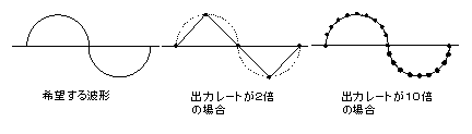 ■パソコンで測定する AOボード編 AOボードは、DAC(デジタル/アナログ変換器)を使用してデジタルデータをアナログ信号として出力します。 DACの性能の範囲であればどのような波形でも作ることができます。 ここでは、AOボードの使用に必要な知識を解説します。 1.出力範囲と分解能 AOボードは、電圧源又は電流源として使用できます。 電圧源の場合は「V」、電流源の場合は「A」でCHごとの出力できる範囲が決められています。 ビット数で表される分解能で出力の変化できる最小幅が決まります。 例えば、出力範囲が±10Vで分解能が12Bitの場合 出力の分解能=20V/2^12=約4.89mV となります。 2.セトリングタイムとスルーレート DACの出力が現在の状態から次に指定された値になるまでの時間をセトリングタイムといいます。 DACの出力を変化できる割合をスルーレートと言います。(凾u/凾s) この二つのパラメータは、次の出力状態への変化の速さを示します。 つまり、セトリングタイムが短くスルーレートが高いDACは高い周波数の出力を生成できるということです。 3.出力レート DACの出力がアップデートされる間隔を出力レートといいます。 例えば1MS/Secの出力レートでは、一秒間に1000000回出力のアップデートがおこなわれます。 このこのパラメータは、DACが出力できる最高周波数を決定します。 ナイキストの定理では、希望する波形の最大周波数の2倍のレートがあれば元の波形を再生できるとなっています。 しかし、実際には2倍程度のレートは図に示すとおり、希望する波形はできません。 出力レートを希望する波形の最大周波数の10倍程度にするのが無難なようです。 4.出力バッファ AIボードには。波形バッファがあるものがあり、ここに波形データを格納させ繰り返し出力させることができます。 例えば、正弦波の1周期分のデータをバッファに格納し、繰り返し出力させるというようなことができます。 また、任意の制御信号をバッファに格納し出力させることができます。 この時の、時間分解能は。出力レートとなります。 AOボードは。単純な電圧源や電流源だけではなく、任意波形発生器やファンクションジェネレータとしても使用できます。 AOボードを有効に使用すると、システムを小型化・ローコスト化できます。 |