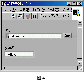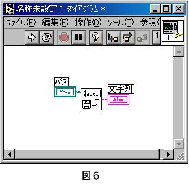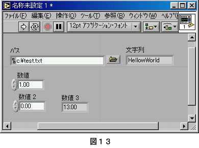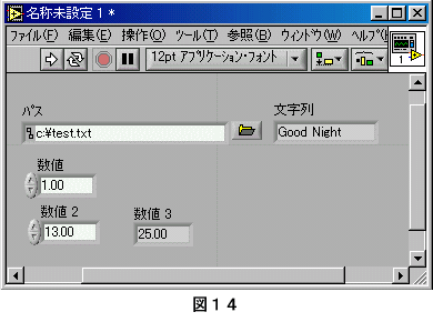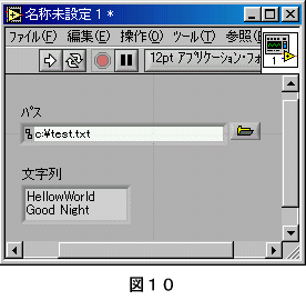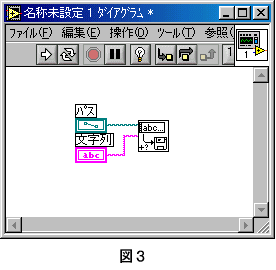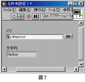 ■ファイルを使ってみよう データを保存しておくには、ファイルを使います。 LabVIEWには、いくつかのファイルを扱う関数があります。(図1) ![]() ここでは、簡単なファイルの使用方法について説明します。 1.データを保存する まずは、データを保存してみましょう。 フロントパネルにファイルパス制御器と文字列制御器を設定します。(図2) ![]() 次にダイアグラムに「Write Characters To File」関数を設定します。(HELPで端子名を確認) 「ファイルパス (空の場合、ダイアログ)」に「パス」を「文字列」に「文字列」を接続します。(図3) ![]() 「パス」に適当なファイル名(パスを含む)を「文字列」に「Hellow」と入力して実行してみてください。(図4) ![]() 指定したパスにファイルができているはずなので、ファイルを開いて中身を確認してください。 「Hellow」と入っていましたか? 2.保存したデータを読込む 1.で作ったファイルを読込むにはどうすればいいでしょうか? フロントパネルにファイルパス制御器と文字列表示器を設定します。(図5) ![]() 次にダイアグラムに「Read Characters From File」関数を設定します。(HELPで端子名を確認) 「ファイルパス (空の場合、ダイアログ)」に「パス」を「文字列」に「文字列」を接続します。(図6) ![]() 「パス」に1.で作成したファイル名(パスを含む)を入力して実行してみてください。 「文字列」に「Hellow」と表示されましたか? (図7) ![]() 3.データを追加する さて、保存するデータは1つとは限らず、複数のデータを一つのファイルに保存したい場合があります。 その時はどうすればいいでしょうか? 1.で作ったViのダイアグラムを見ます。 「Write Characters To File」関数の「ファイルに連結? (新規ファイル:F)」端子にブール定数の「True」を接続します。(図8) ![]() 「パス」に適当なファイル名(パスを含む)を「文字列」に「World」と入力して実行してみてください。 1.で作成したファイルを開いて中身を確認してください。 「HellowWorld」と入っていましたか? 4.データを一行づつ追加する 3.の方法では、データの区切りがわからないので、読込んだ時困ります。 そこで、データ間に区切り(カンマ、タブ、復帰改行等)文字を入れてデータを区切ります。 区切り文字を「復帰改行」にすると、「復帰改行」をデータの区切りと認識するViを使って必要なデータを抽出できます。 3.で作ったViのダイアグラムを見ます。 ダイアグラムに「復帰改行」定数と「Concatenate Strings」関数を設定し、接続します。(図9) ![]() 「文字列」を空白のまま一回実行します。 次に「文字列」に「Good Night」と入力して実行してみてください。 1.で作成したファイルを開いて中身を確認してください。 「HellowWorld」のあと改行されて「Good Night」と入っていましたか? 5.データを一行づつ読込む 4.で作成したファイルを2.で作成したViで読込んでみてください。 「文字列」の表示エリアを下に大きくしてみると、「HellowWolrd」と「GoodNight」が改行されて表示されていますか?(図10) ![]() これでは、区切り文字を入れた意味がありません。 そこで、一行ずつ読込む方法を次に示します。 4.で作成したViのフロントパネルにデジタル制御器を2つ、デジタル表示器1つを設定します。(図11) ![]() ダイアグラムの「Read Characters From File」関数を削除します。 次に「Read Lines From File.vi」関数を設定します。(HELPで端子名を確認) 「ファイルパス (空の場合、ダイアログ)」に「パス」を「文字列」に「文字列」を接続します。 「行数 (全て:-1)」に「数値」を「読み取りオフセットの開始 (文字:0 )」に「数値2」を接続します。 「読み取り後のマーク (文字)」に「数値3」を接続します。(図12) ![]() 「数値」に「1」を入力し、実行しましょう。 「文字列」に「HellowWorld」、「数値3」に「13」と表示されましたか?(図13) ![]() 次に「数値2」に「数値3」に表示された「13」を設定して実行してみてください。 「文字列」に「GooodNight」、「数値3」に「25」と表示されましたか?(図14) ![]() 「数値」には、1回に読込む行数(復帰改行の数)「数値2」には、ファイルの何文字目から読込むかを設定します。 また「数値3」には、読込みの終了した位置(次に読み込みを開始する位置)が出力されます。 これらの数値をうまく利用することにより、1行づつデータを読込むことができます。 ファイル関係の関数はこの他にいろいろとあります。 ファイルの操作は、プログラム作成には、重要な技術です。 確実にマスターする必要があります。 |
