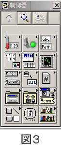 ![]() 1.プログラム(VI)を作るための準備 左側の一番上のボタン「新規VI」を押して ください。 「名称未設定1」タイトルバーに書かれた ウィンドウが開かれます。(図2) これがフロントパネルといって、ユーザー インターフェースとなる部分を作るウィンド ウです。 |
