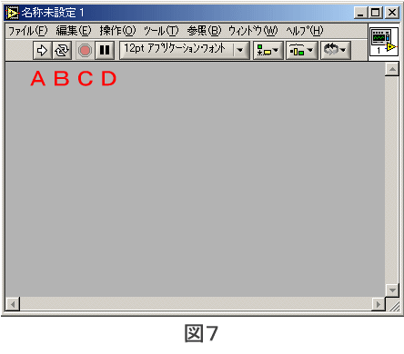 また、これとは別にタイトルバーに「制御器」「ツール」と書かれたウインドウが開いています。 「制御器」と書かれているのが、「制御パレット」(図3)といって、ユーザーインターフェースとなる、制御器や表示器が格納 されています。 ![]() 「ツール」と書かれているのが、「ツールパレット」(図4)といって、制御器を操作したり、ワイヤ を引いたりするツールが格納されています。 ![]() フロントパネルの下にも「名称未設定1ダイアグラム」とタイトルバーに書かれた ウインドウが開いています。(図5) ![]() これがダイアグラムウィンドウといってプログラムを書くウインドウです。 ![]() ここにも、これとは別に「関数」「ツール」と書かれたウインドウが開いています。 「関数」と書かれているのが「関数パレット」(図6)といって、プログラムを書くのに必要な関数が 格納されています。 2.パレットの使い方 パレットの使い方には、2種類あります。 パレットを常時表示させておく方法と必要な時だけ表示する方法です。 メニューのウィンドウ→制御パレット(関数パレット)を表示で、パレットを表示したり、非表示にした りできます。 ・パレットを常時表示させておく場合 「文字列表示器」を選択する方法を例にやってみましょう。 マウスポインタを制御器パレットの右最上部の「文字列&パス」にもっていき左クリックします。 「文字列&パス」パレットになるので、右最上部の「文字列表示器」にマウスポインタをもっていき 左クリックします。 マウスポインタが手の形になるので、そのままマウスを動かし、フロントパネルの上にもっていき、 再度左クリックします。 フロントパネルに「文字列表示器」が設定されます。 制御器やダイアログでの関数も同じです。 ・パレットを非表示にしておく場合 これも「文字列表示器」を選択する方法を例にやってみましょう。 フロントパネルの上で右クリックします。 「制御器パレット」が表示されるので、マウスポインタを制御器パレットの右最上部の「文字列& パス」にもっていきます。 「文字列&パス」パレットが表示されるので、そのまま右最上部の「文字列表示器」にマウス ポインタをもっていき左クリックします。 マウスポインタが手の形になるので、そのままマウスを動かし、フロントパネルの上にもっていき、 再度左クリックします。 フロントパネルに「文字列表示器」が設定されます。 制御器やダイアログでの関数も同じです。 3.ツールパレットの使い方 ツールパレットでは、マウスポインタの機能を設定します。 各ボタンを押すことにより、マウスポインタの形が変わり各機能になります。 ここでは、主な機能について説明します。 ・オブジェクトの操作 フロントパネルでボタンを押したり、ダイアグラムでシーケンスを変えたりなどの操作をおこないます。 ・オブジェクトの位置決め/サイズ変更/選択 制御器や関数を移動させたり、大きさを変更したりします。 ・テキストの編集 ラベルや文字列定数のテキストの編集をおこないます。 ・ワイヤの接続 関数や端子をワイヤで接続するのに使用します。 4.ヘルプの表示 LabVIEWには、関数や制御器の機能や端子の説明が書かれているヘルプウインドウ(図6)があります。 このウインドウを表示しておけば、いちいちリファレンスを見ることなく、機能や端子の仕様を知ることができます。 ・ヘルプウインドウの表示のしかた CTRL+H又は、メニュー→ヘルプ→ヘルプを表示を選択します。 5.プログラムの実行 ![]() A(図7)のボタンが実行ボタンです。 このボタンを押すと一回だけプログラムが 実行されます。 その右隣のB(図7)のボタンは、プログラ ムが連続的に実行されます。 (連続実行ボタン) 再度同じボタンを押すか、さらに右隣の C(図7)のボタンを押すまで実行を続け ます。 C(図7)のボタンは、プログラムの実行を 中止します。(中止ボタン) D(図7)のボタンは、プログラムの実行を 中断します。(中断ボタン) 再度押すと、実行を再開します。 |