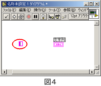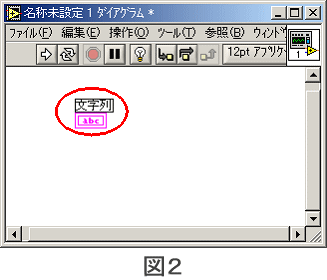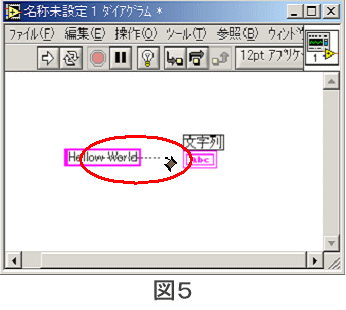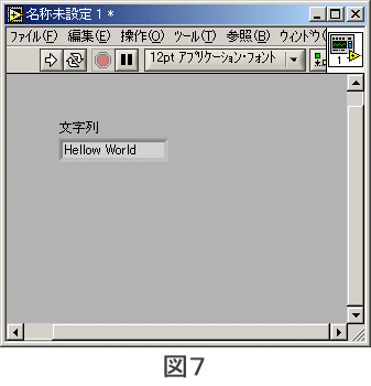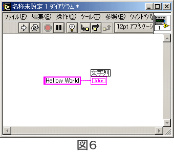 1.新規VIの作成起動画面で「新規VI」ボタンをクリックし、新規のフロント パネルとダイアグラムを表示します。 2.表示領域の作成 制御器パレット「文字列&パス」→「文字列表示器」(図1) を選択し、フロントパネルの適当な場所に設定します。 3.プログラム(ダイアグラム)の作成 フロントパネルの下にあるダイアグラムをアクティブにします。 ダイアグラムには、「文字列」とラベルのついた端子がありますので適当なところに移動させます。(図2) ![]() ![]() 関数パレット「文字列」→「文字列定数」 (図3)を選択し、端子の左側におきます。 ![]() ツールパレット「テキストの編集」を選択し、文字列定数を選択 します。 文字列定数が編集状態(図4)になるので、「Hellow World」と 入力してください。 4.端子と文字列定数の接続ツールパレット「ワイヤの接続」を選択し、文字列定数を左 クリックしてからマウスを端子の方に移動してください。 (図5) ![]() 文字列定数から点線がでてきますので、そのまま端子まで 引っ張り、端子の上で再度左クリックしください。 ワイヤが破線から実線に変わります。(図6) これで、プログラムは完了です。 では、実行してみましょう。 フロントパネルを選択し、実行ボタンを押してください。文字列表示器に「Hellow World」と表示されましたか?(図7) 再度実行する場合は、ツールパレット「テキストの編集」を選択し、 文字列表示器の表示を削除してから実行してください。 せっかく作ったので保存しおきましょう。 メニュー「ファイル」→「保存」で表示されたファイルダイアログに適 当なファイル名を入れて保存します。 読込む場合は、メニュー「ファイル」→「開く」で表示されたファイル ダイアログから開くVIを選択します。 どうですか? 簡単でしたよね。 参考までにC言語で書くと次のようになります。 #include <stdio.h> main() { printf("hello World\n"); } |
