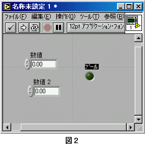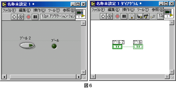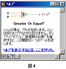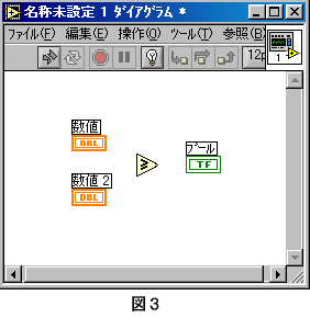 ■比較関数とブール制御器/表示器 LabVIEWには、データの比較をおこなう関数があります。(図1) 比較の結果はブール値として出力され、正しければ「TRUE」(真)、間違っていれば「FALSE」(偽)が出力されます。 では、簡単な比較のプログラムを作ってみましょう。 1.入力と出力の設定 フロントパネルにデジタル制御器を2つと円LEDを1つ設定します。(図2) ![]() 2.比較関数の設定 ダイアグラムに「Grater Or Equal?」関数(≧)を設定します。(図3) ![]() 3.関数の端子の確認 CTRL+Hを押し、ヘルプウィンドウを開きます。 ダイアグラム上の「Grater Or Equal?」関数の上にマウスポインタを置きます。 ヘルプウィンドウには、「Grater Or Equal?」関数の端子の位置が表示されます。(図4) ![]() 4.プログラム(ダイアグラム)の作成 ダイアグラム上のデジタル制御器「数値」と「Grater Or Equal?」関数の入力端子「x」を接続します。 デジタル制御「数値 2」を「Grater Or Equal?」関数の入力端子「y」に接続します。 ブール表示器「ブール」に「Grater Or Equal?」関数の出力端子「x>=y」を接続します。(図5) ![]() デジタル制御器に適当な数値を入れて実行してみてください。 正しい結果が、円LEDに表示されましたか?(比較が正しければLEDが点灯します。) 「Grater Or Equal?」関数を他の比較関数にして確認をしてみてください。 また、押しボタンを円LEDに接続して実行しみてください。(図6) 押しボタンの出力がブール値であることが確認できます。 ![]() |