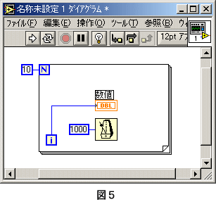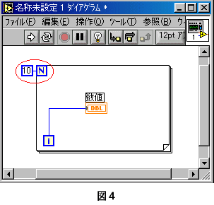 ■Forループストラクチャの使い方 Forループは、処理を指定回数実行します。 ●Forループの出し方 1.関数パレット→ストラクチャ(左最上段)→ケース(右から二番目最上段) 2.ダイアグラムの上で、左ボタンを押しながらマウスを動かすと破線で四角がひけいます。(図1) ![]() 3.左ボタンをはなすと、Forループストラクチャが表示されます。(図2) ![]() ●Forループストラクチャを使ってみよう 1.新規VIを開きます。 2.フロントパネルにデジタル表示器を設定します。 3.ダイアグラムにForループストラクチャを設定します。 4.デジタル表示器の端子をForループストラクチャの中に設定し、「i」端子を接続します。(図3) ![]() 5.Forループストラクチャの左上の「N」端子に数値定数を「10」と設定し接続します。(図4) ![]() 6.Forループストラクチャの中に「Wait Until Next ms Multiple」関数を設定し、文字列定数を「1000」と設定し接続します。(図5) ![]() 実行してみましょう。 デジタル表示器の値が0〜9まで変化するのを確認してください。 「N」端子に接続した値を変えて実行してみてください。 Forループストラクチャは、同じ処理を指定回数繰り返す時に使用します。 |